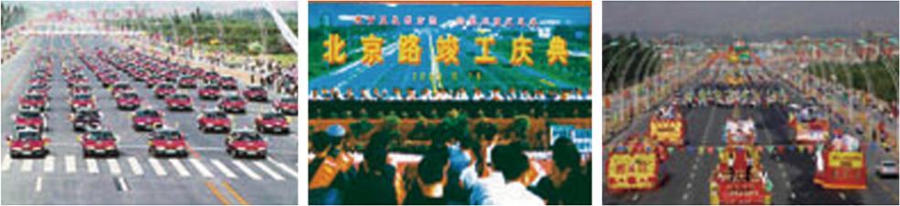 舉行北京路竣工通車慶典,天氣特別明媚,陽光分外燦爛。有數(shù)不清的市民擁向慶典主會場——新建的西夏廣場。慶典活動非常隆重、熱烈,鼓樂喧天、禮炮齊鳴。出席慶典的人們分乘披紅掛彩的公交車、中巴車,與慶典花車、摩托車、出租車、小轎車等組成的300多輛的機動車方隊,無比喜悅與自豪地游覽50里長的北京路。北京路兩旁站滿了各界群眾,他們載歌載舞,喜不自禁。