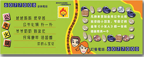 為了充分利用門(mén)票背面的廣告資源,我們考慮找一個(gè)商家來(lái)贊助。一個(gè)偶然的機(jī)會(huì),我們聯(lián)系剛剛到“金元公牛仔火鍋城”做策劃的王川先生,能否讓“金元公?;疱伋?rdquo;贊助廣告??衫习逭J(rèn)為,門(mén)票廣告是面對(duì)學(xué)生的,學(xué)生又不來(lái)就餐。我們說(shuō)可通過(guò)門(mén)票廣告引導(dǎo)學(xué)生家長(zhǎng)來(lái)就餐,老板要求我們拿出方案再說(shuō)。