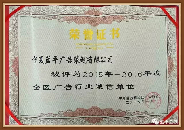 熱烈祝賀寧夏藍平廣告策劃有限公司(藍平企劃)被評為2015年-2016年度全區(qū)廣告行業(yè)誠信單位!
